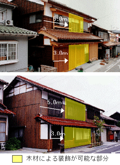 ■ 天然の素材にこだわりましょう!●【考え方】 長期的な視点でまちづくりを考えたとき、使用する素材選びには、時間が経てば経つだけその風合いを増し、味わいを増す天然の素材を用いましょう。 ●【留意事項】 ・日光の建築物は木造のものが多いので、火災への対応等の配慮が求められる。 ・地元の素材を部分的にでも積極的に使う。 ・街路空間にも天然の素材が使用されることになっている。 建物の素材にこだわることで、街路空間と調和したまちなみの創出が期待できる。 ●【参考】 ○建築への適用 建築には、杉、檜などの木材や、竹、なしめ石、大谷石、御影石、銅、などを上手く利用するとよいでしょう。 ![]() 純木造建築(日光物産) ![]() 大谷石の石蔵 ![]() 小林邸 石張りと板壁の合築 ○木造建築物の外壁の構造について 日光の建物は、木造建築がほとんどです。 木造建築の場合、可燃材である木材を外壁に使用する板張りの装飾は、建築基準法による規制により、隣地境界線から1階部分は3m、2階部分は5mでは延焼の恐れがあるため使用できません。 つまり、壁面に木材など可燃材の装飾を行えるのは、下の黄色く示した部分となります。 ただし、窓や玄関戸、格子戸などの建具を木製とすることや付柱はこれに当たりません。 また、鉄筋造や鉄筋コンクリート造の場合、このような規制はありません。 ![]() |