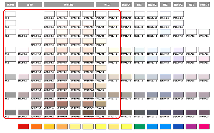 ■ 壁面と屋根の基調となる色を尊重しましょう!●【考え方】 建物の色は、自然素材に馴染むように素材の色(茶=木、グレー=石 等)を基調とし、これに調和する色を用いましょう。 屋根の色は、壁面の色との調和を考え、「日光国立公園日光地域管理計画書」に基づく色を用い、色彩における街並みの調和を図りましょう。 ●【留意事項】 ・日光東町の街なみ基調色として用いてほしい色相は、マンセル表色系の、無彩色、赤(R)、青赤(YR)、黄(Y)である(下表赤枠に対応)。 ・下表下段の原色(生色)やパステルカラーは、素材の色に馴染まず、また、退色しやすく汚れが目立ちやすいため、経年変化や汚れに強い低彩度色を用いるようにする。 ●【参考】 ○「日光国立公園日光地域管理計画書」 環境省自然環境局 北関東地区自然保護事務所、平成13年12月より < 屋根の色の取扱方針 > ・色彩は焦げ茶系色、茶系色、暗灰系色又は黒色であること。 ただし、銅板、黒灰色の和瓦 等を用いる。 ○日光の伝統的な屋根の色とは… 日光の屋根の色は伝統的に、黒であった。 日光では風土的に瓦屋根が付かず、トタン屋根が主流であった。 そのトタン屋根をコールタールで黒く塗るのが一般的であった。 ○日光東町の街並み(壁面)の基調色 (図中、赤い枠の範囲が用いてほしい色) ※この規範は画面表示であるため、 一覧表示の色はあくまでこんな色のイメージとして捉えてください。 画像をクリックすると拡大図が別ウィンドで表示されます。 |